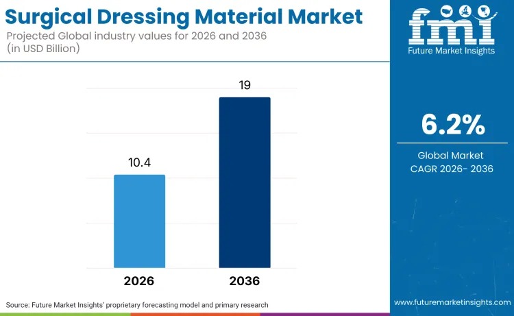 The Surgical Dressing Material Market is gaining strategic importance as healthcare systems worldwide prioritize infection prevention and evidence-based wound management. Future Market Insights (FMI) projects the market to grow from USD 10.4 billion in 2026 to USD 19.0 billion by 2036, reflecting a robust CAGR of 6.2%. This expansion is directly linked to rising surgical volumes, broader healthcare access, and the shift toward advanced wound-care protocols.
